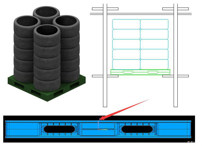 通過圖片對比可以發現,如果使用塑料托盤與貨架搭配,配合機械叉車是不是存取產品變的更方便了呢。這種塑料托盤一般設計成長寬相同的正方形,并且以雙面網格或者雙面平板為主。因為要放置四摞輪胎,所以要求塑料托盤的尺寸一般在1.6米以上,并且內置鋼管以增加其強度,在托盤的中心位置可預留RFID卡槽,以實現存儲的自動化。